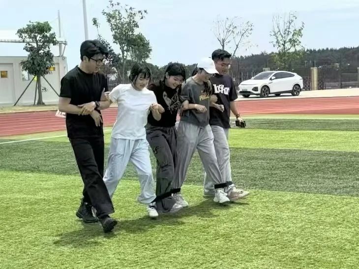 随着哨声响起,教工五人六足比赛开启。五位老师并排站定,相邻的脚被紧紧绑在一起。他们齐声喊着口号“一二、一二”,步伐从略显凌乱迅速调整得整齐划一,身体默契前倾,奋力向前冲。有人差点摔倒,却被身旁老师迅速拉稳,没有丝毫停顿,继续加速。冲过终点线那一刻,他们欢呼拥抱,脸上洋溢着胜利的喜悦 ,现场掌声雷动。