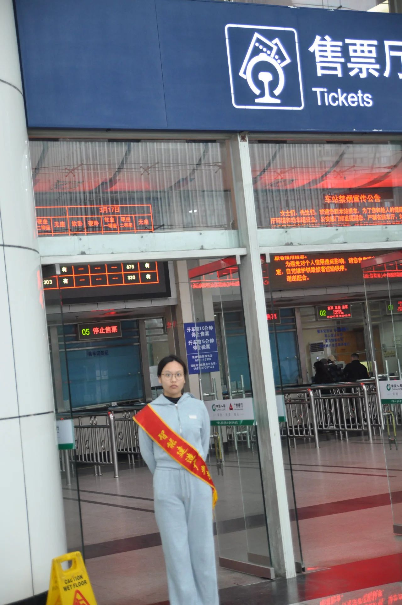 火车站是城市的窗口,人员流动量大,需要更多的帮助和关怀。同学们在火车站的各个角落忙碌着。