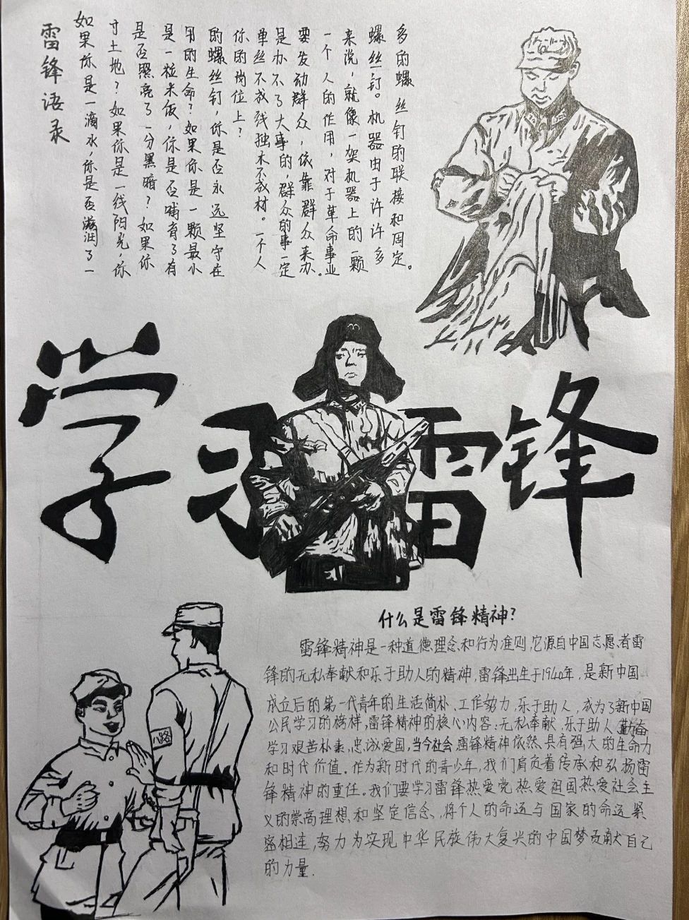 本次雷锋月手抄报比赛在全校师生的热情参与下取得了圆满成功。活动启动后,同学们积极响应,踊跃投稿,在作品征集阶段,收到了大量构思精巧、饱含深情的手抄报作品。这些作品从多个维度对雷锋精神进行了生动诠释,无论是对雷锋经典事迹的细致描绘,还是对新时代雷锋精神传承的创新展现,都充分体现了同学们对雷锋精神的深刻理解。
