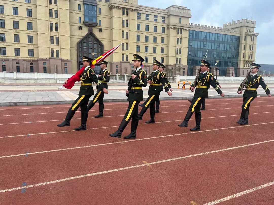 踏着整齐的步伐,国旗护卫队缓缓护送国旗进场。升国旗、奏国歌、全体师生行注目礼,伴随《义勇军进行曲》的响起,全体师生庄严肃立,目视着国旗冉冉升起,在风中飘扬。