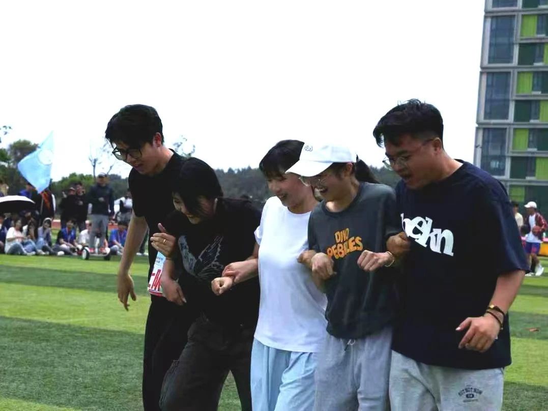 随着哨声响起,教工五人六足比赛开启。五位老师并排站定,相邻的脚被紧紧绑在一起。他们齐声喊着口号“一二、一二”,步伐从略显凌乱迅速调整得整齐划一,身体默契前倾,奋力向前冲。有人差点摔倒,却被身旁老师迅速拉稳,没有丝毫停顿,继续加速。冲过终点线那一刻,他们欢呼拥抱,脸上洋溢着胜利的喜悦 ,现场掌声雷动。