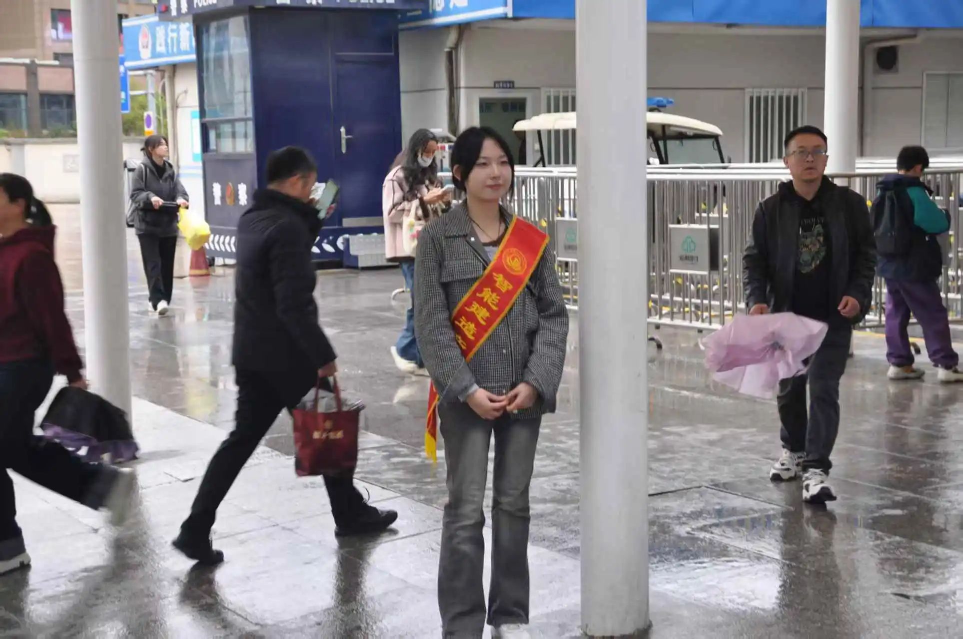 火车站是城市的窗口,人员流动量大,需要更多的帮助和关怀。同学们在火车站的各个角落忙碌着。