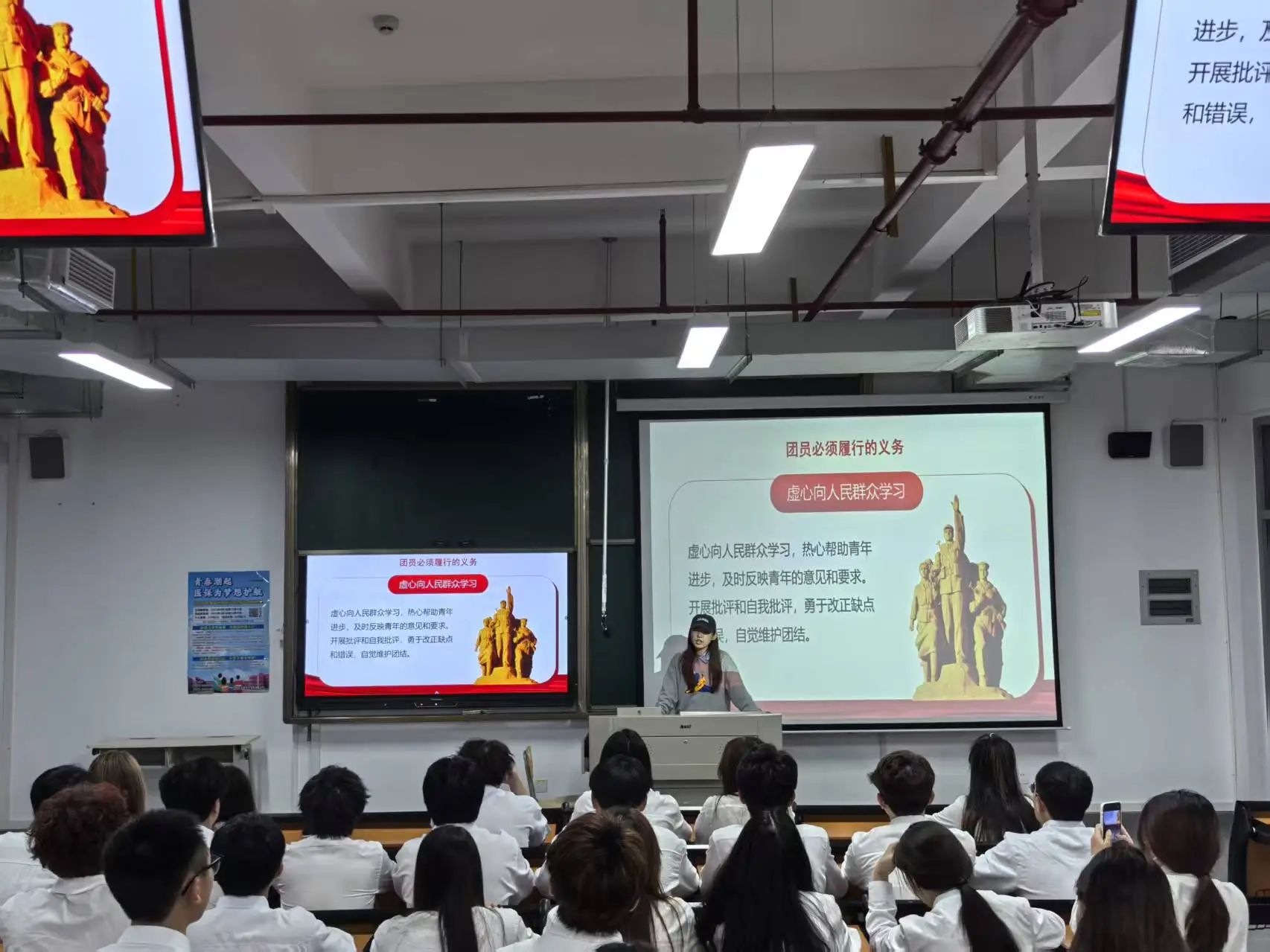 本次团课王明媚老师带领同学们回溯共青团的发展历程。从1922年共青团的诞生,到新民主主义革命时期,共青团引领广大青年为民族独立和人民解放事业英勇奋斗,无数热血青年投身反帝反封建斗争,他们的身影穿梭在硝烟与呐喊中,用青春和热血谱写壮丽篇章。