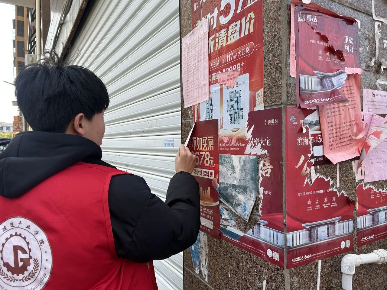 与此同时,部分同学们彼此配合默契,分工合理,充分发扬了不怕苦、不怕脏、不怕累的雷锋精神,对商铺门口以及小区楼道墙面上张贴的小广告展开彻底清理。在整个清理过程中,一处一处地耐心细致清理,不放过任何一个角落,力求将小广告清除得干干净净。对于那些粘贴较为松动的小广告,同学们更是直接上手,小心翼翼地将它们从墙体上撕离,不给这些破坏环境美观的“不速之客”留下丝毫的生存空间。