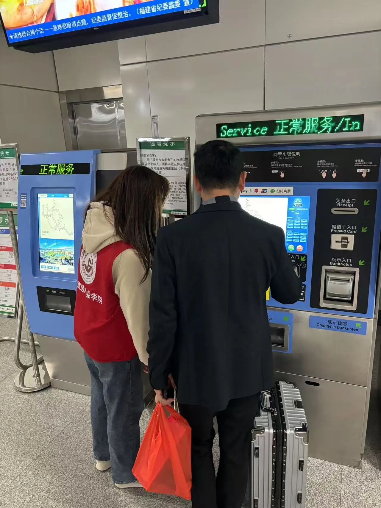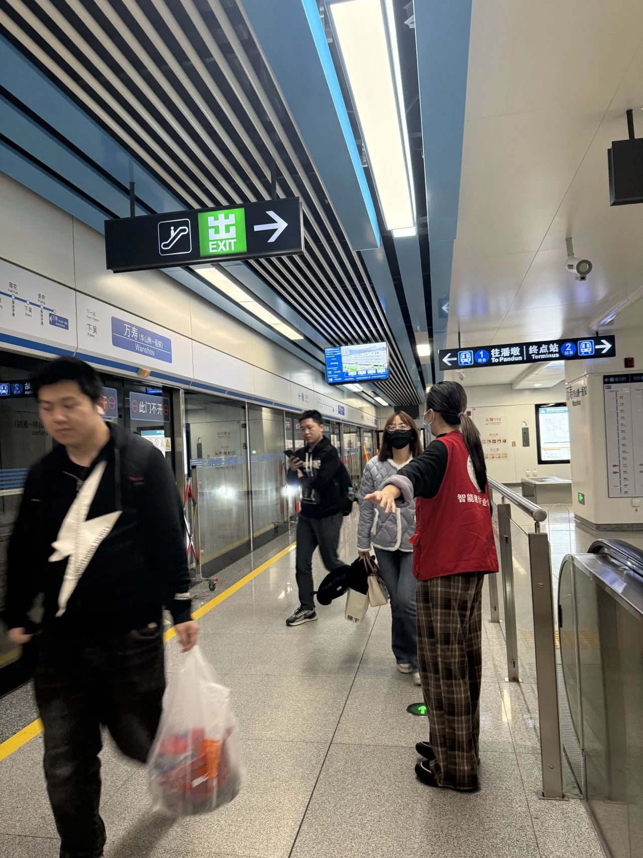 身穿红马甲的志愿者们分布在万寿站的各处,指引乘客如何购票、如何换乘、如何使用自助售票机等,帮助乘客顺利地完成乘车流程,认真地疏导着南来北往的客流有序出入,用最诚挚的服务,传递志愿精神。