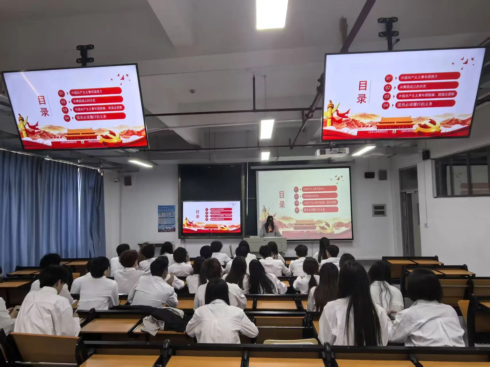 接着,团课深入剖析共青团的组织架构与运行机制。从基层团支部到上级团委,每一个层级都肩负着独特的职责,如同精密齿轮,相互协作,推动共青团不断前进。在讲解中,同学们了解到团支部作为共青团最基层的组织,是联系青年的桥梁和纽带,通过组织各类团日活动、志愿服务等,将团员青年紧密团结在一起。清晰的组织架构展示,让同学们认识到共青团强大的凝聚力和战斗力来源,也明白了自己在团组织中的位置和责任。