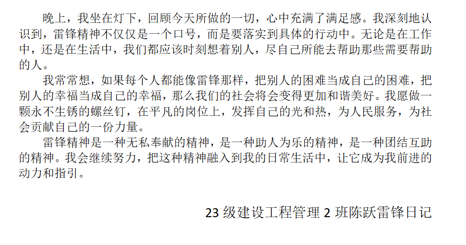 最后,团支书表示作为新时代青年要学习雷锋同志热爱党、热爱祖国、热爱社会主义的崇高理想和坚定信念,树立正确的世界观、人生观、价值观。同时还要学习雷锋同志服务人民、助人为乐的奉献精神,积极参与志愿服务,帮助他人,快乐自己。