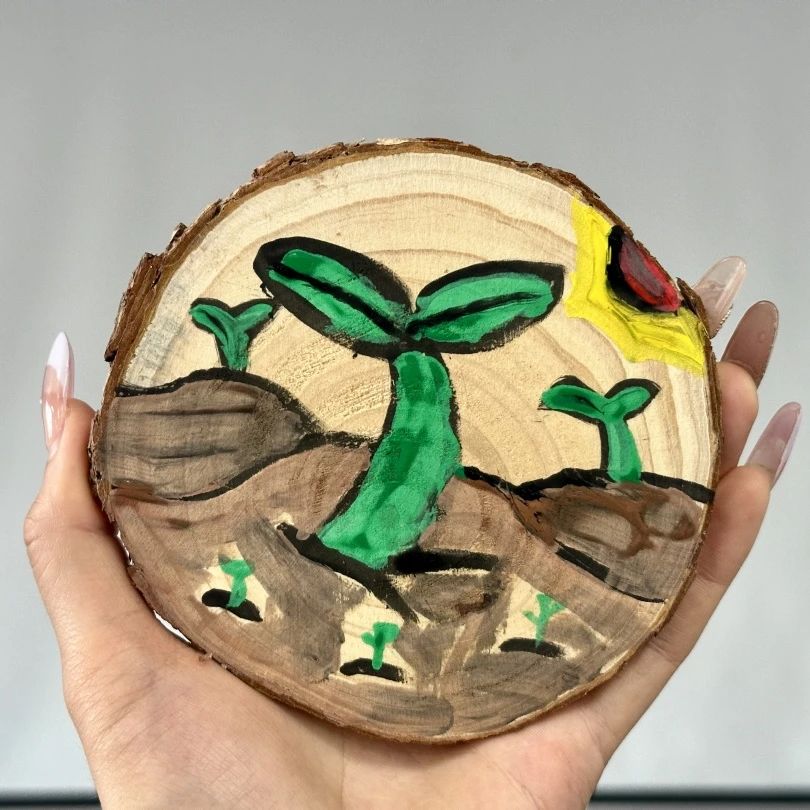 同学们将对植树节的理解与呵护自然的心意,悄然融入一片片树片之中。放眼望去,一幅幅作品绚丽夺目、别出心裁。每一次下笔都传递着对植树节意义的深度思索,对绿色未来的无限憧憬 。