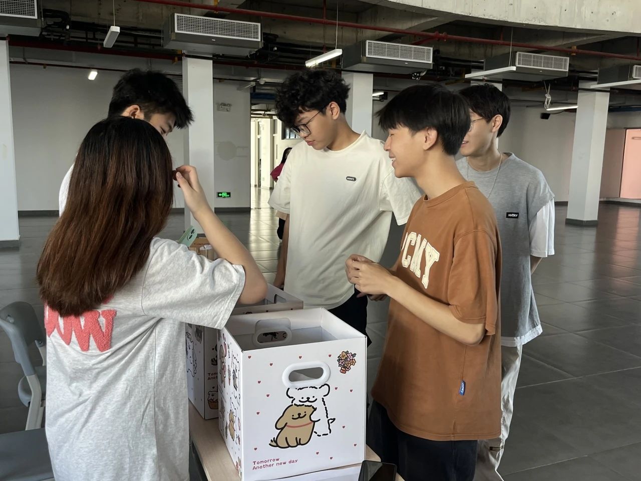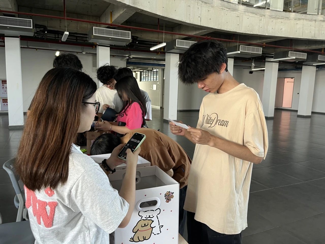 随着下课铃声的响起,陆陆续续的同学们前来挑战,他们需要在箱子里面抽取纸条,纸条上的绕口令有难度简单、中等、困难三种模式,涵盖不同的发音和语速要求,同学们需要在规定的时间内流畅、准确读完即可获得相对应的礼品。