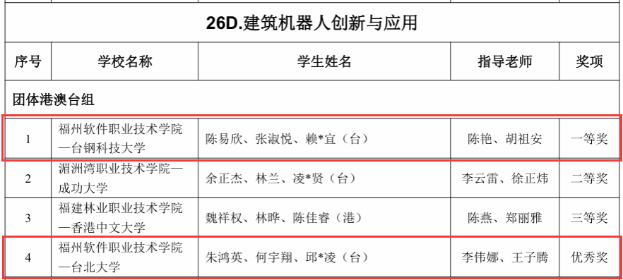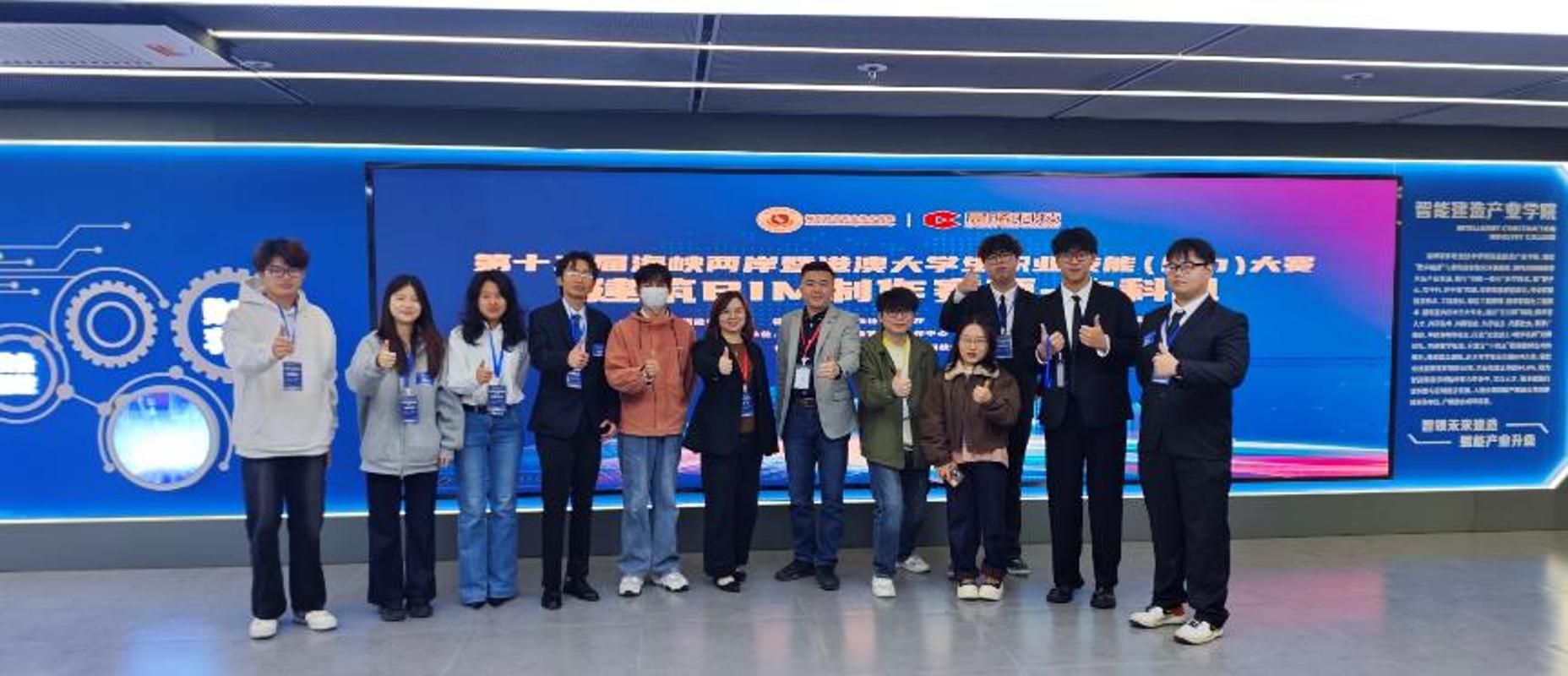 近日,由福建省教育厅、福建省人力资源和社会保障厅、福建省互联网信息办公室、平潭综合实验区管委会联合主办的第十二届海峡两岸暨港澳大学生职业技能(能力)大赛圆满落幕。我校智能建造产业学院学生在“建筑BIM制作”赛项与“建筑机器人创新与应用”赛项团体港澳台组中表现出色,荣获一等奖2项、二等奖1项、三等奖1项及优秀奖3项。