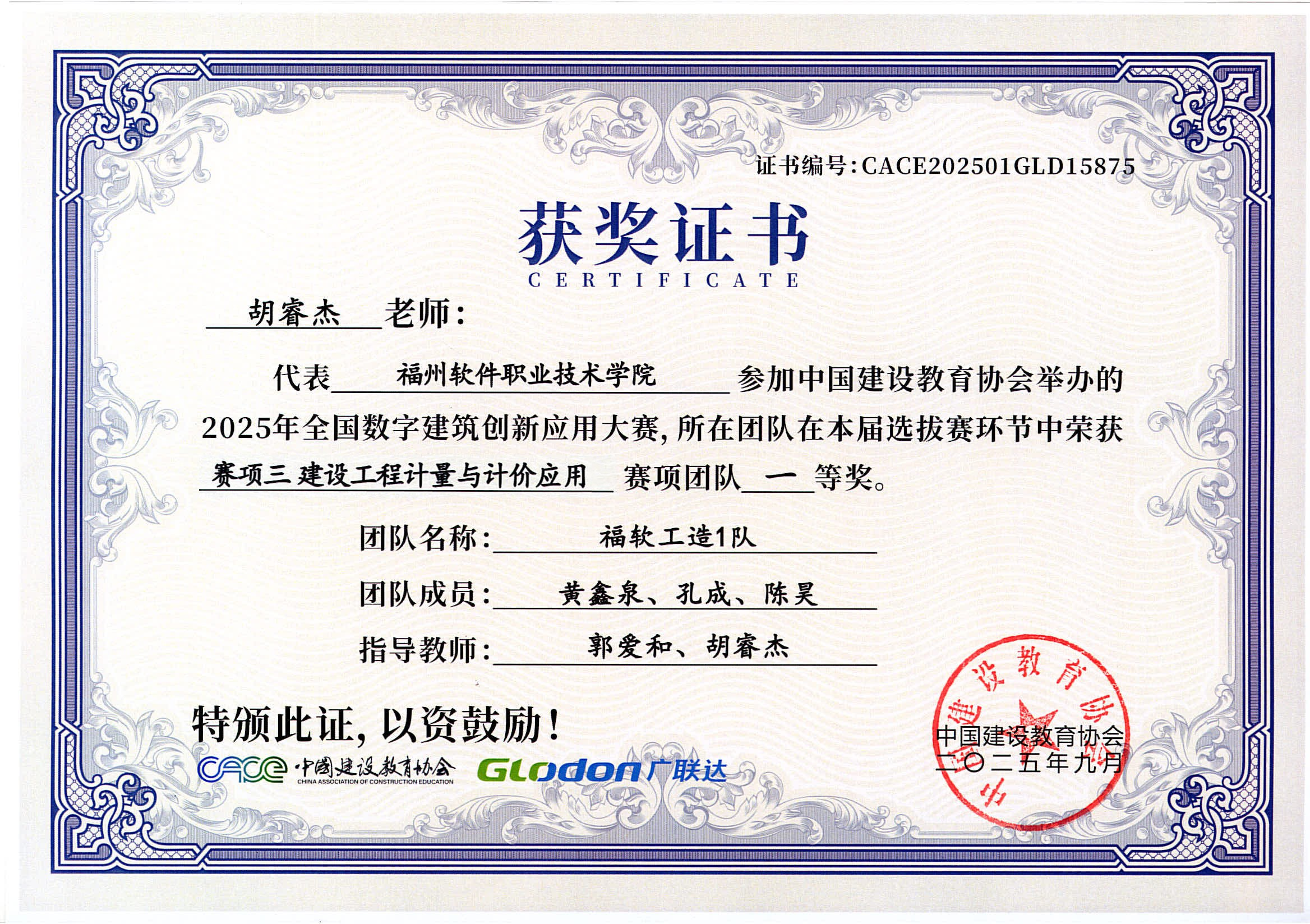 在这场聚焦数字建筑前沿技术与实践应用的竞技舞台上,我校工程造价专业学生黄鑫泉、孔成和陈昊在郭爱和、胡睿杰两位老师的悉心指导下,凭借扎实的专业技能和出色的团队协作,在激烈的竞争中脱颖而出,喜获“建设工程计量与计价应用”赛项全国一等奖。这一优异成绩充分彰显了学校在智能建造与数字建筑领域深化教学改革、强化实践育人方面取得的显著成效。