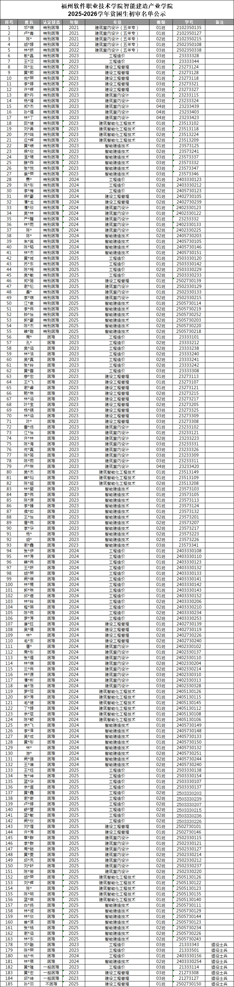 根据福建省教育厅等九部门关于印发《福建省家庭经济困难学生认定办法》(闽教规〔2023〕1号)、《福州软件职业技术学院家庭经济困难学生认定管理办法》(福软学〔2023〕31号)、《福州软件职业技术学院国家助学金管理办法(修订)》(福软学〔2025〕54号)。智能建造产业学院开展2025-2026学年贫困生认定评审工作,经个人申请、班级评议、系统评估、学院评审,现将智能建造产业学院国家助学金初审名单进行公示,公示期三天(2025年11月14日-11月18日)。公示期间如有异议,请在公式期内向智能建造产业学院学生资助工作认定小组反映情况。